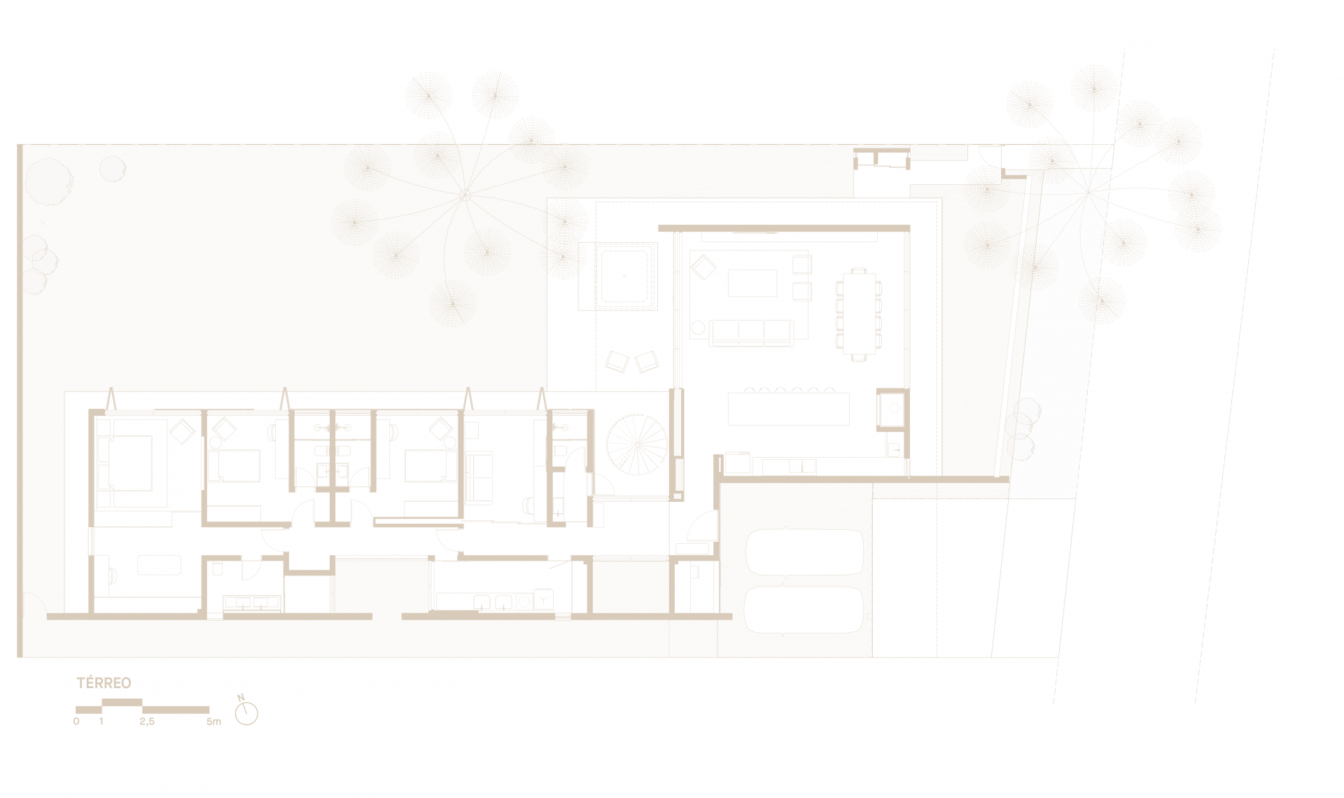 In this well-lit clearing with winds directed by the mountains, the entire house was built on the ground level, with the social area near the street and the service/private sector in the most private part of the lot. With a configuration in the shape of an "L," an extensive sunny lawn was created for family activities.
