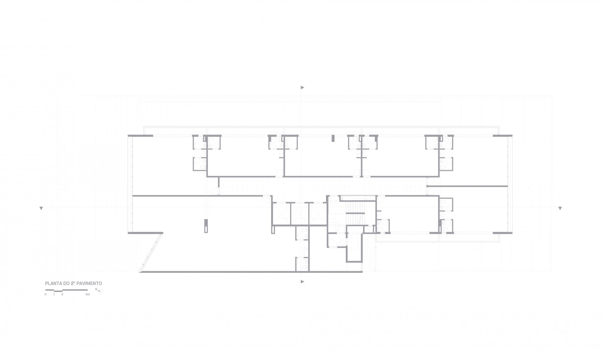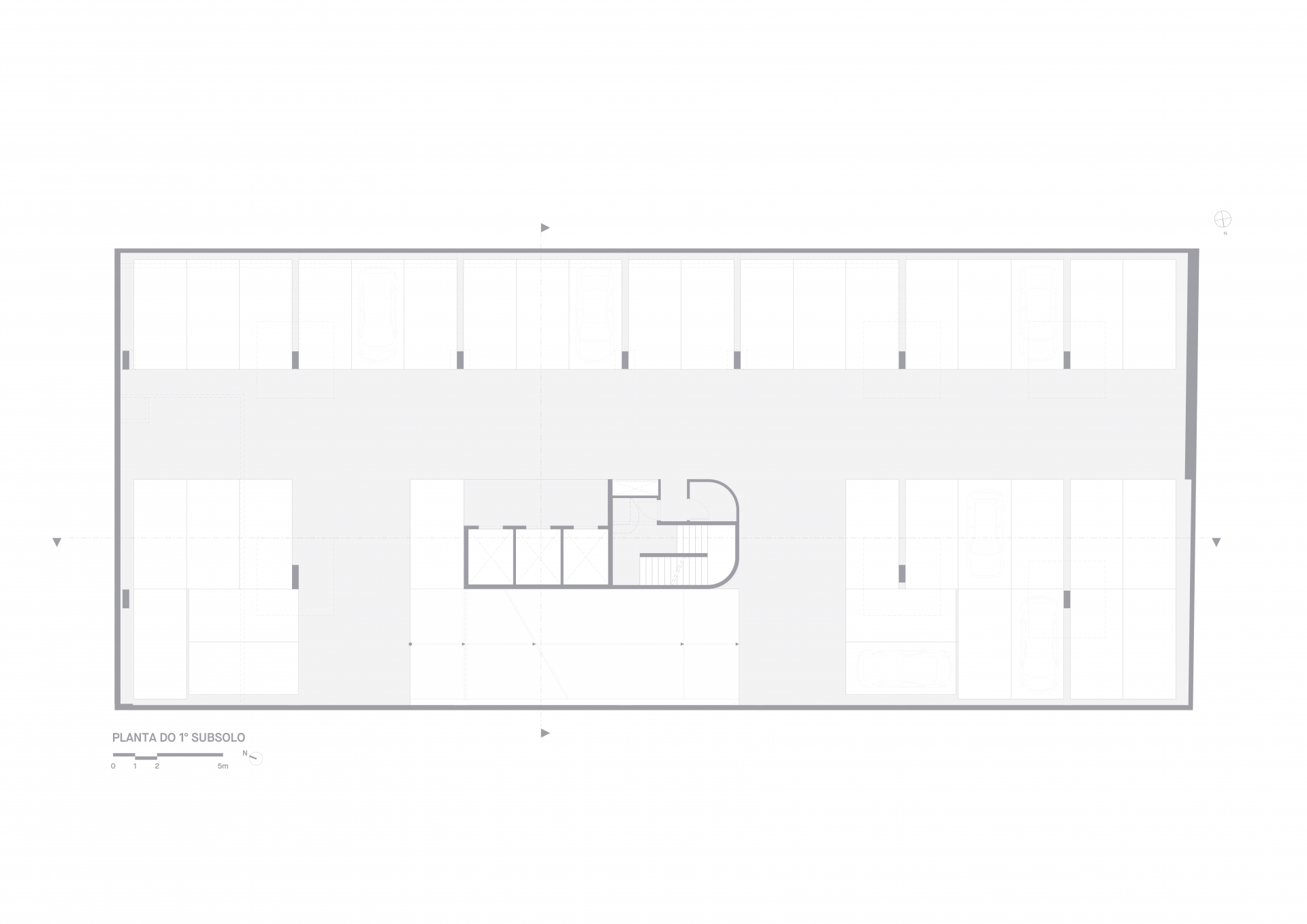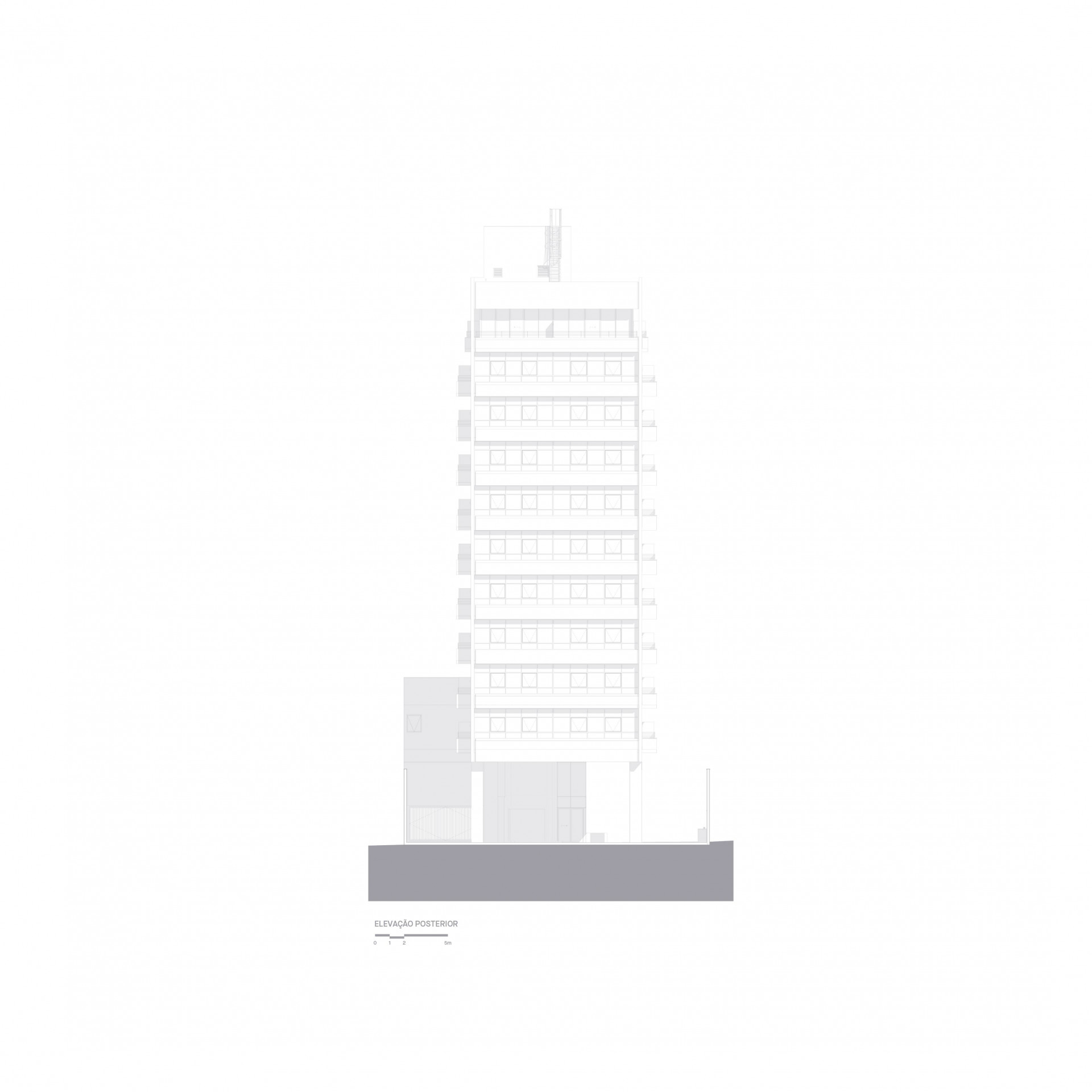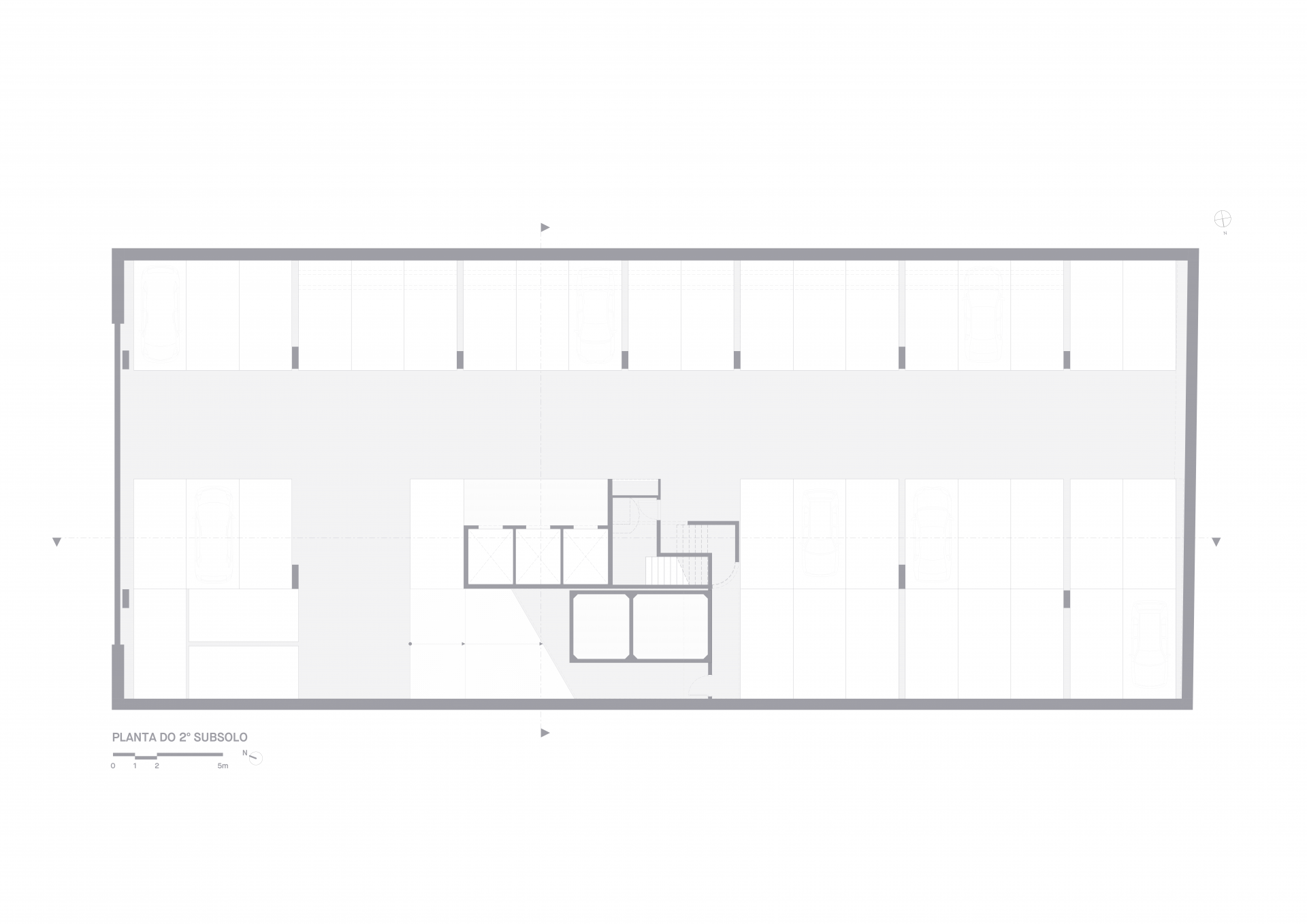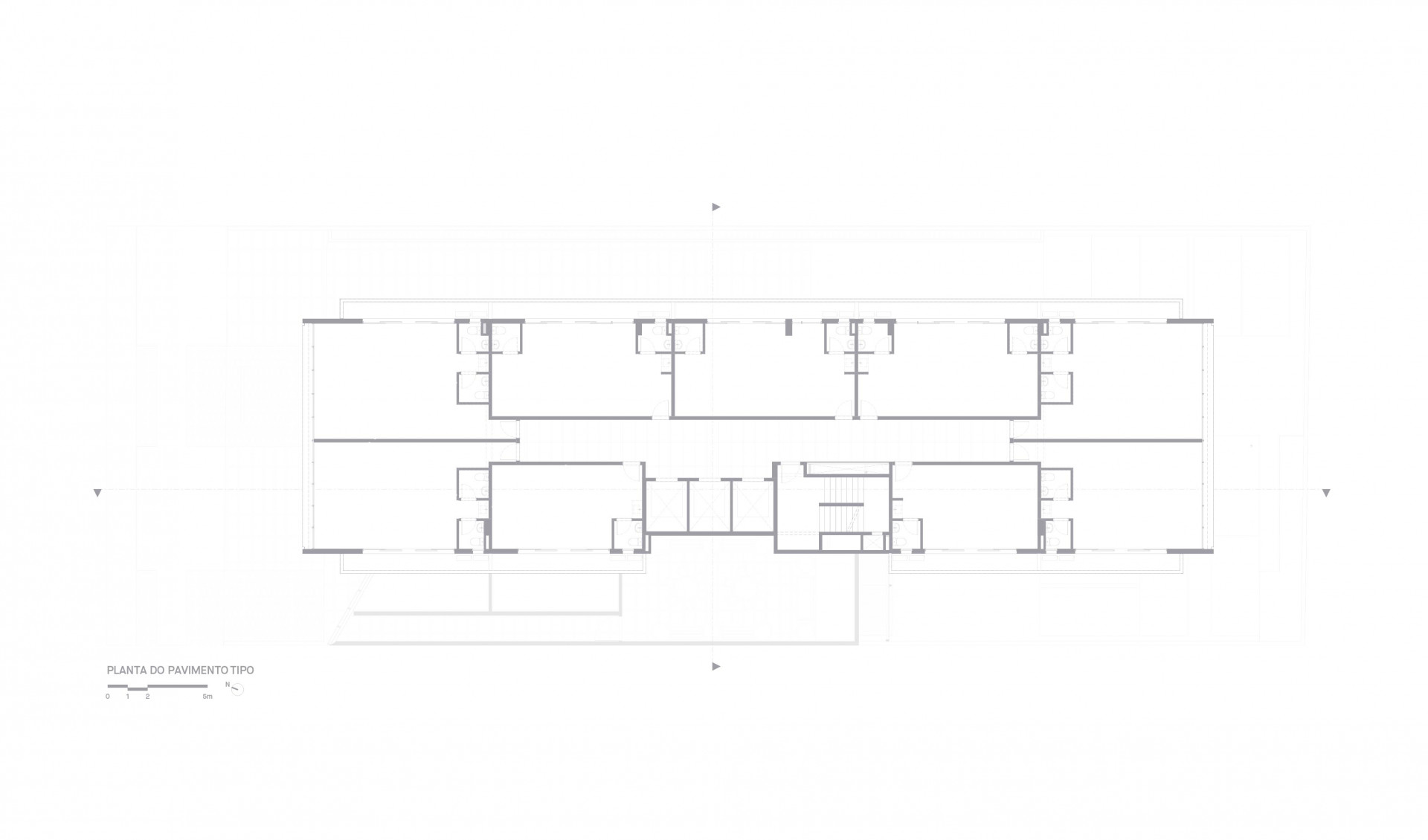 The typology of commercial office buildings is characterized by glass facades that envelop the entire building, creating a seal with the external spaces. In our proposal, we aimed to establish a connection with the exterior through balconies, ensuring necessary lighting and ventilation by incorporating openings that extend the internal space. Furthermore, the balconies mark the floors and give the building a rhythm and horizontality. Another feature we sought to introduce was the possibility of reversing the commercial office typology into corporate floorplates, through the strategic positioning of the structure and the vertical shafts along the perimeter of the floor.