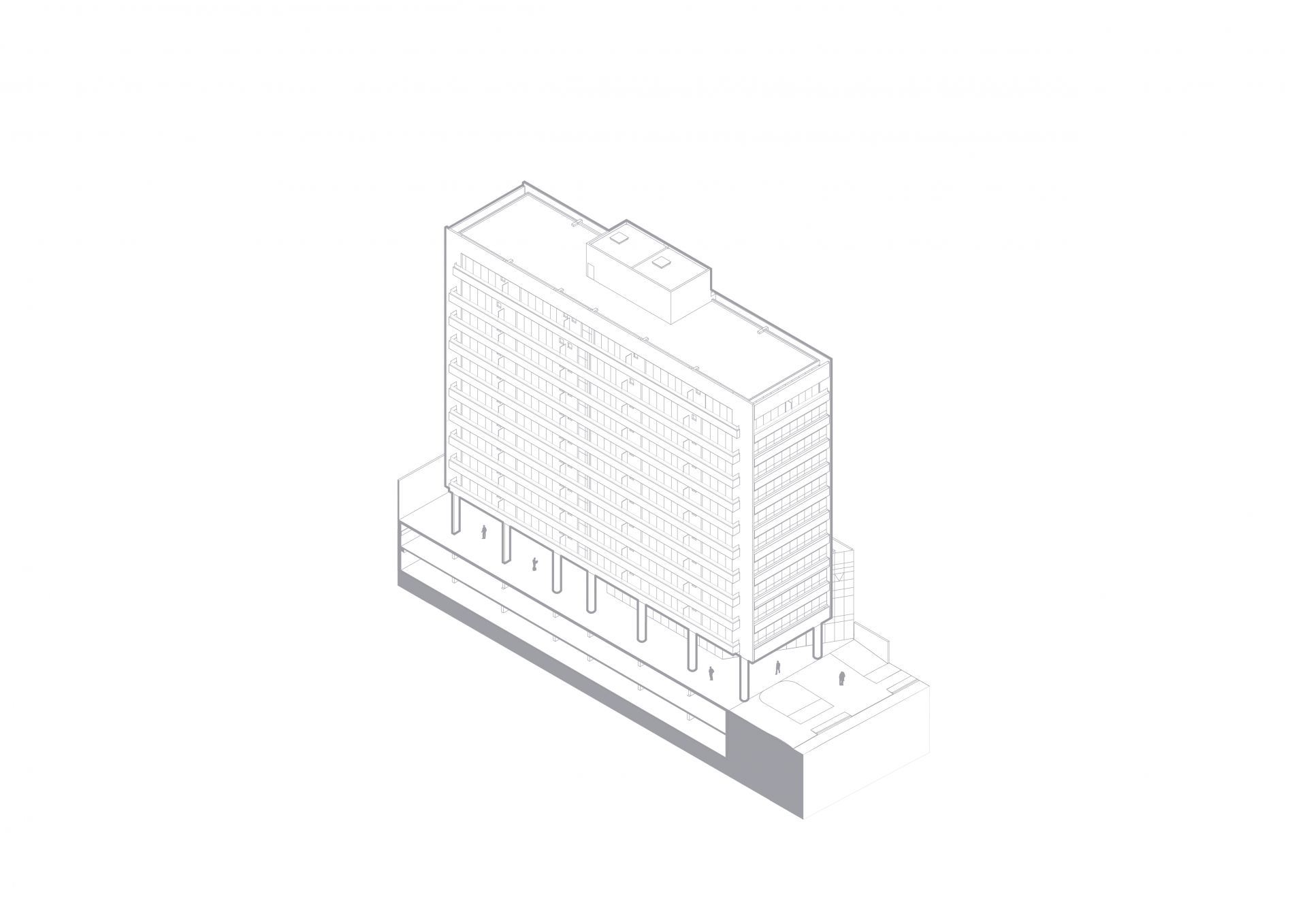 The openness is defined by how the building engages with the street. At ground level, the first floor generously opens up to the sidewalk with a large transparent volume that leans into the lot, like an invitation to enter. The glass dissolves the boundaries between interior and exterior, and the pilotis lift the concrete tower, creating a continuous flow between the city and the building.