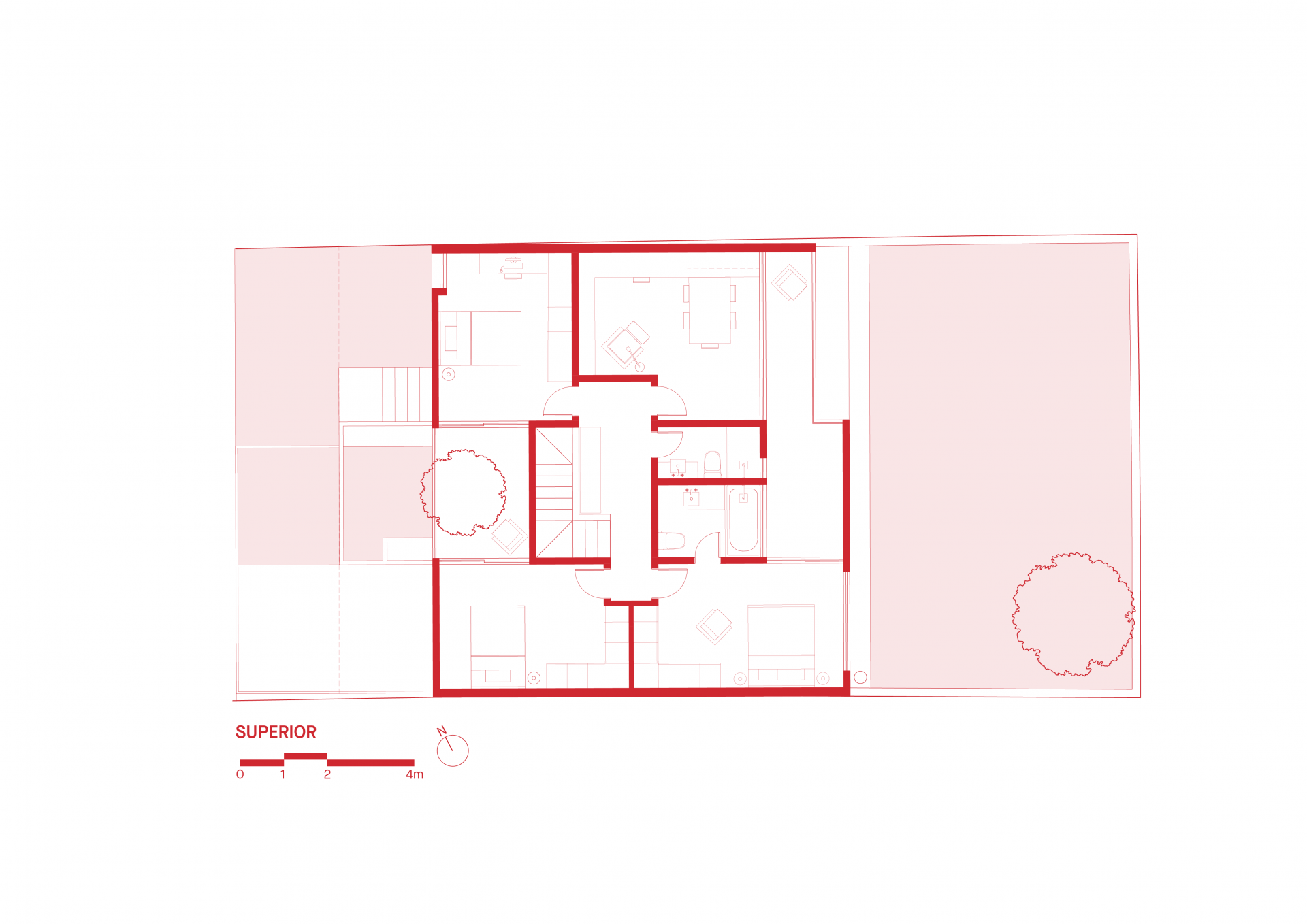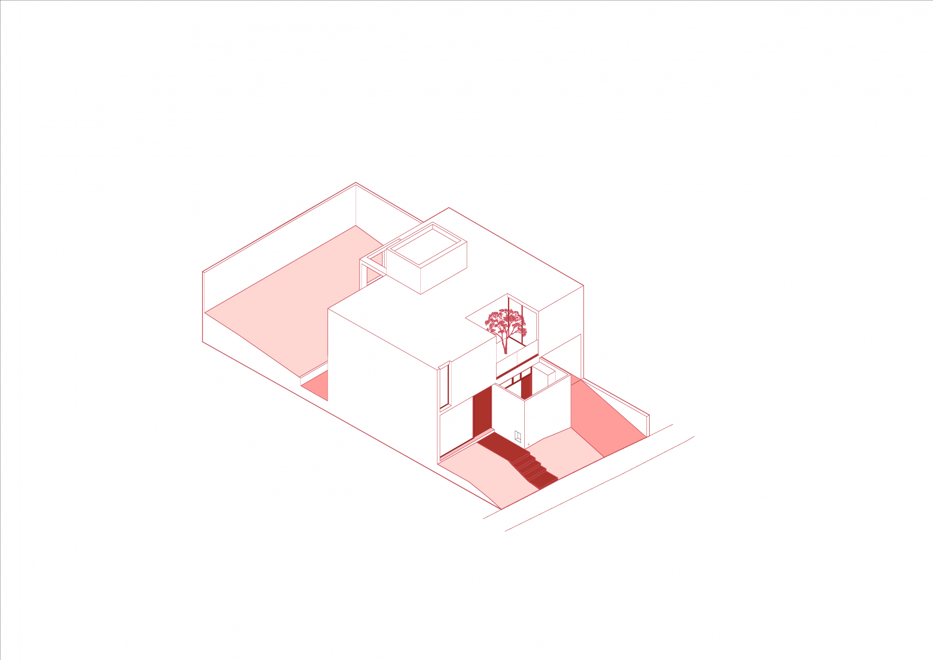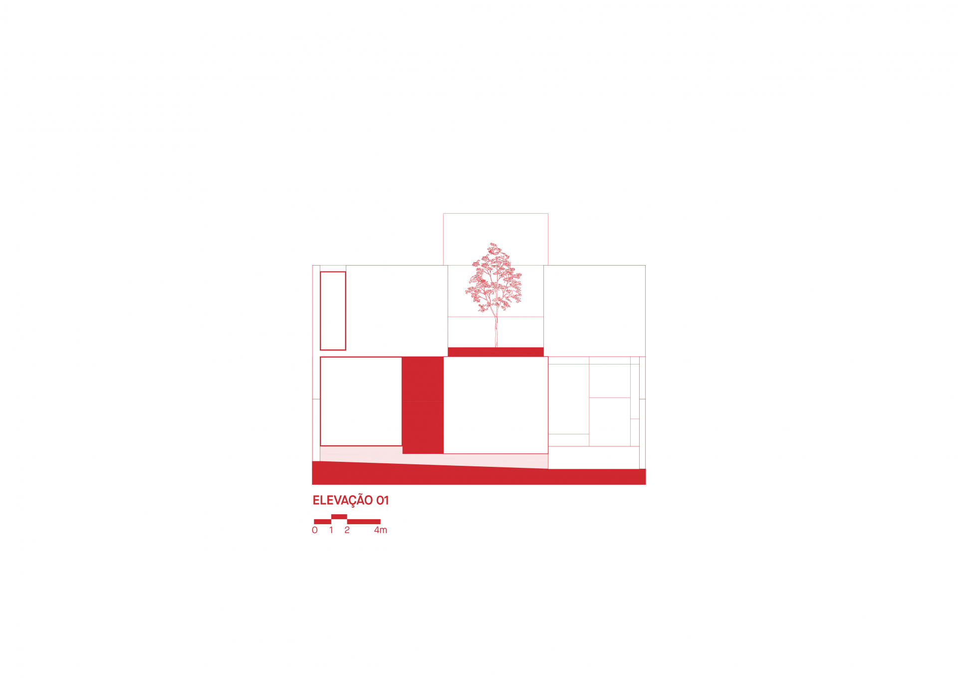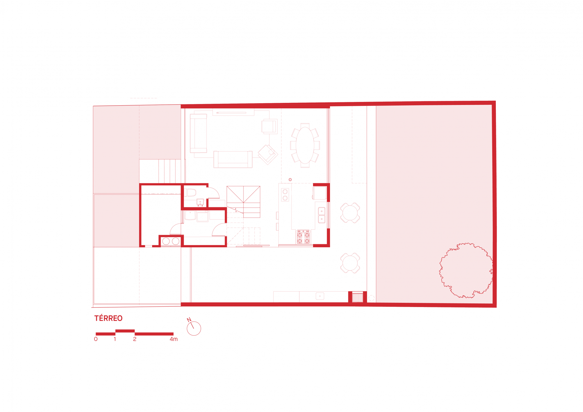 Light and warmth were the first and most emphasized premises made by clients: a young couple with two daughters. Another request was great communication between the house and its gardens. The lot is located in a gated community in the Pilarzinho neighborhood, in an upper region of the northern area of ​​Curitiba, next to large parks and green areas. It starts as a single block, which is stuck to the side limits of the lot and in the average elevation, to guarantee free space at the back, a minimum need for land movement, and a good elevation of the house because of the view. In this way, a modulation was created where the stairs and the hydraulic infrastructure are located to the center, leaving the ground floor open, allowing the use of a conventional and low-cost structure. On the first floor, there are in the center: the toilet, an open kitchen, the service area, and a staircase – due to the positioning in the middle of the house, it is made of sheet metal, in the search for lightness. On the left section is the social area of ​​the house, with large openings that connect the living and dining room to the access garden as well as to the back garden. Also, in the right section of the house, there is a large void that serves as a shelter for vehicles and also as an extension of the social area. On the second floor, due to the pursuit of the morning sun, requested by the clients, a suite was positioned above the garage and with a view to the garden. The daughters' rooms are at the front of the house, and gets the afternoon sunlight. The library/studio was positioned in the region with the lowest solar incidence. At the center of the volume are the bathrooms, a space for a cabinet, and the staircase. Once the organization was defined, the process of subtraction and addition of volumes began, looking at improving the entry of light into the house. On the ground floor, it was added a front patio connected to the service area. On the second floor, two balconies were used: from the suite, where light and heat are coming from the north; and the daughters' rooms, thus creating a playful atmosphere in an environment of exclusive access for the sisters, contemplated with a jabuticaba tree. Solved the question of lighting through a high ceiling, white walls, and floor-to-ceiling frames, we focused on the thermal comfort. Based on thermal studies, the best scenario is a combination of ceramic block standing and drywall walls isolated with rock wool to guarantee thermal quality both in winter and summer. The warmth of the house also comes with the choice of colors: two shades of orange and one of red on the floor, with epoxy paint, and red on the frames, reinforcing the solar concept of the house. Finally, back to the base of the whole project: the sun.