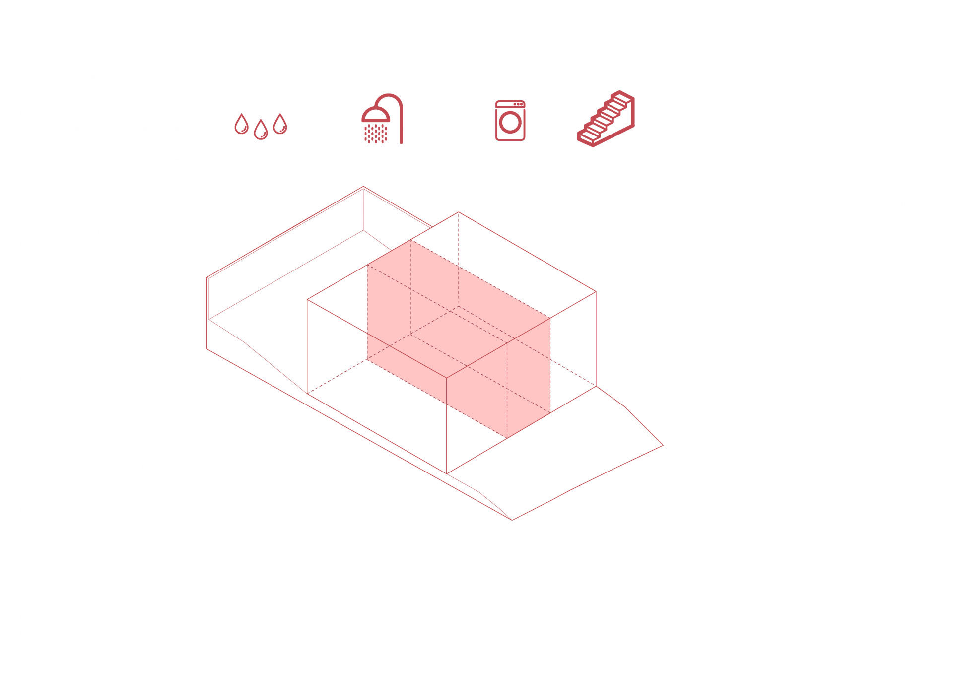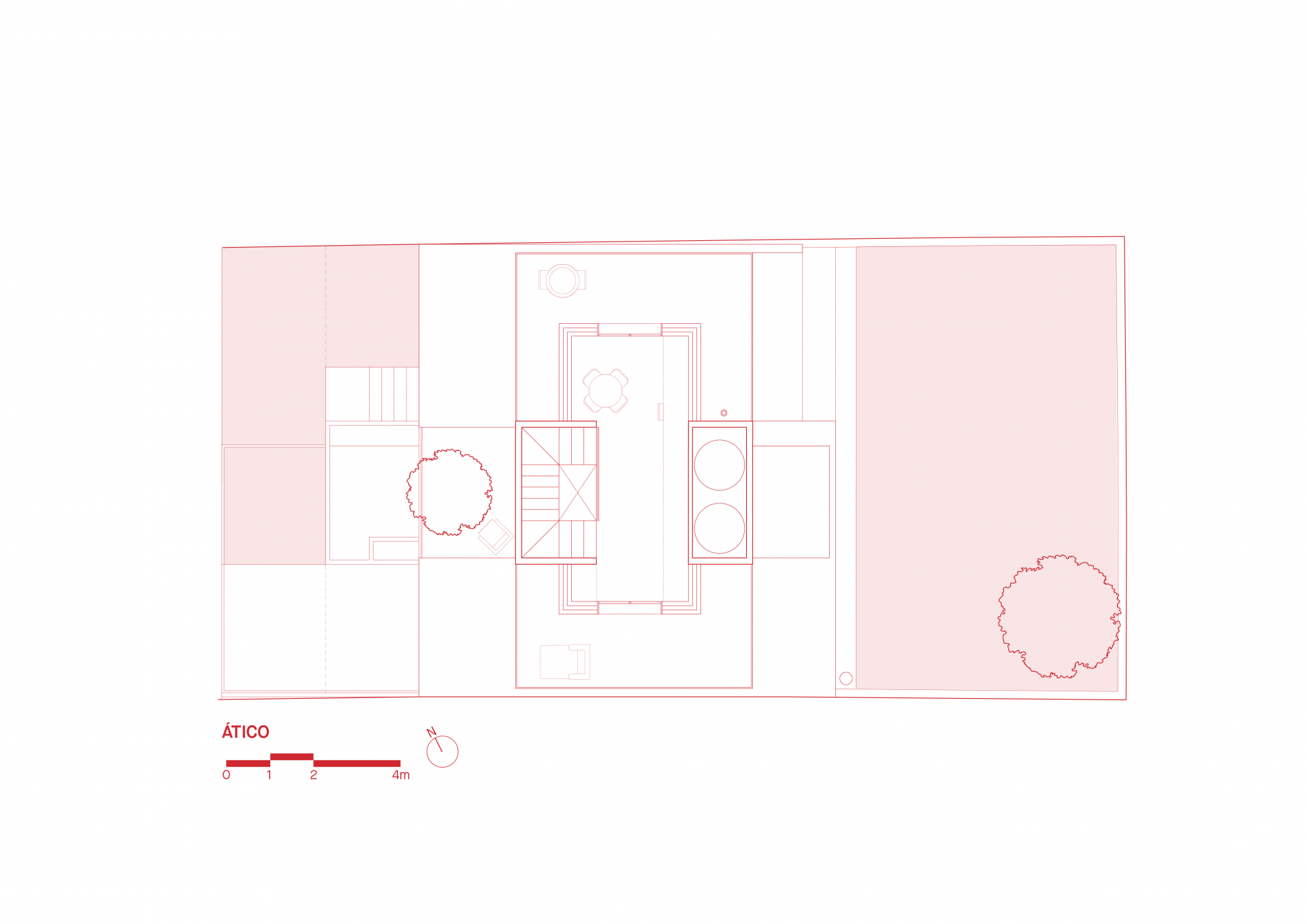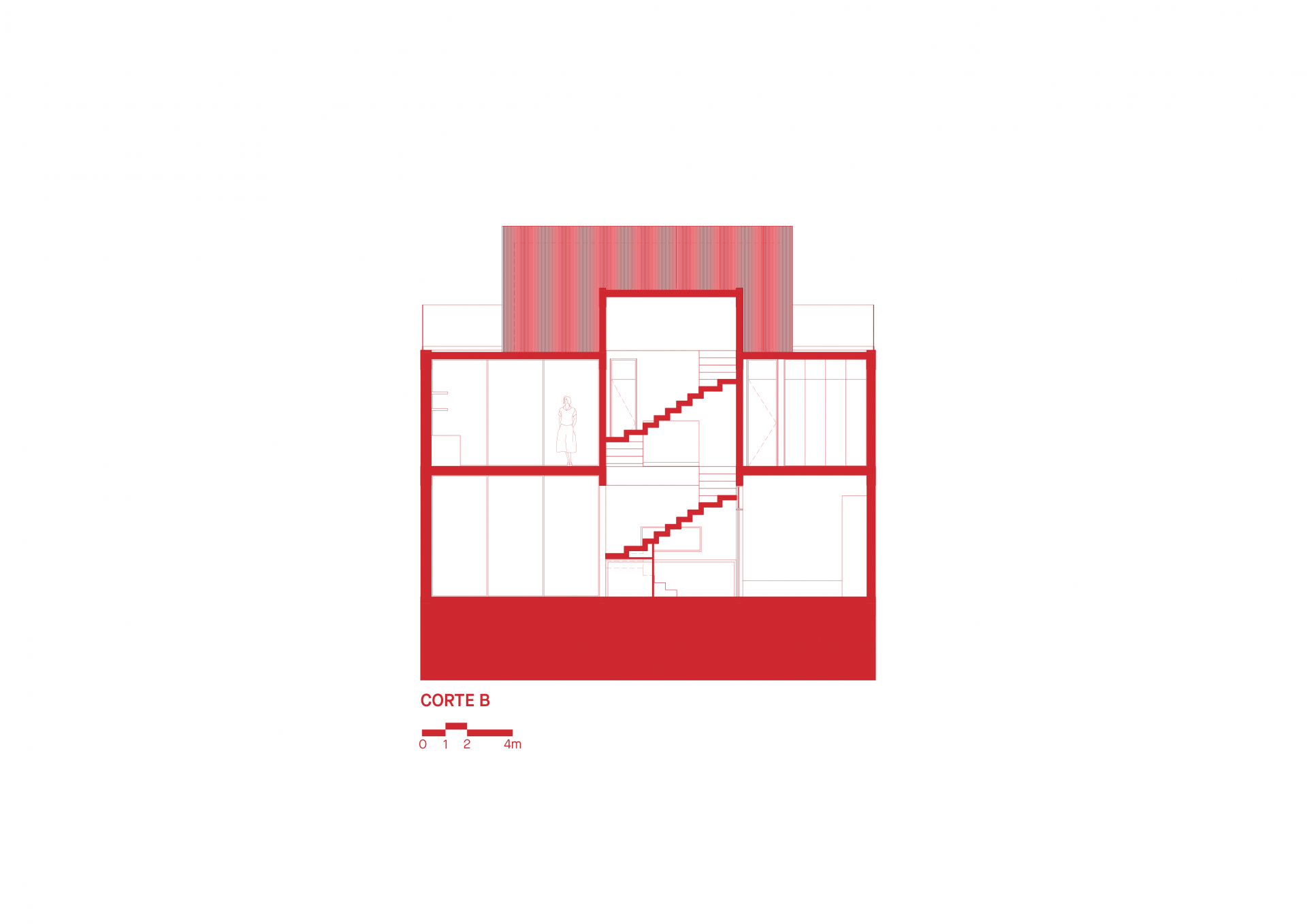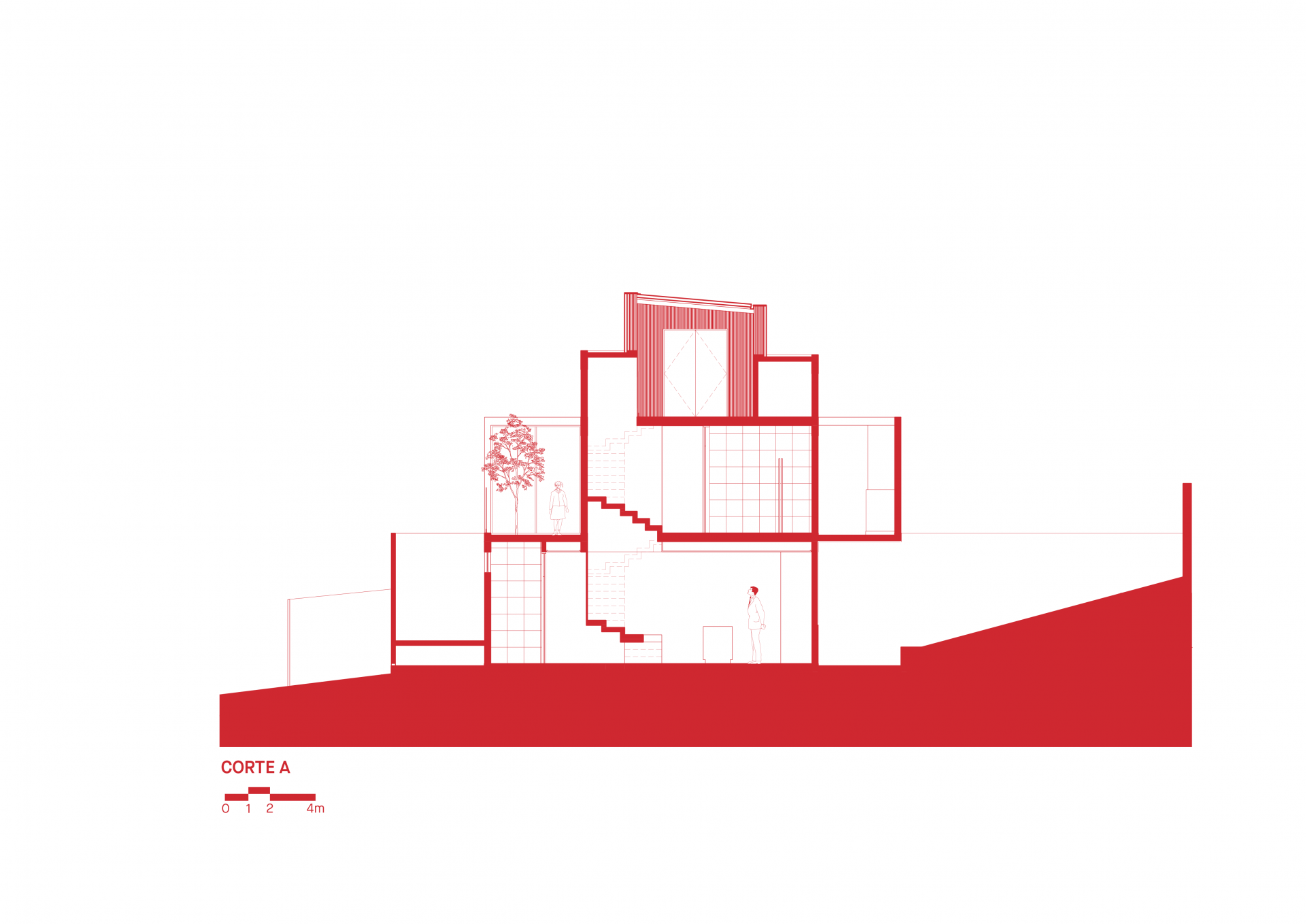 Light and warmth were the first and most emphasized premises made by clients: a young couple with two daughters. Another request was great communication between the house and its gardens. The lot is located in a gated community in the Pilarzinho neighborhood, in an upper region of the northern area of ​​Curitiba, next to large parks and green areas. It starts as a single block, which is stuck to the side limits of the lot and in the average elevation, to guarantee free space at the back, a minimum need for land movement, and a good elevation of the house because of the view. In this way, a modulation was created where the stairs and the hydraulic infrastructure are located to the center, leaving the ground floor open, allowing the use of a conventional and low-cost structure. On the first floor, there are in the center: the toilet, an open kitchen, the service area, and a staircase – due to the positioning in the middle of the house, it is made of sheet metal, in the search for lightness. On the left section is the social area of ​​the house, with large openings that connect the living and dining room to the access garden as well as to the back garden. Also, in the right section of the house, there is a large void that serves as a shelter for vehicles and also as an extension of the social area. On the second floor, due to the pursuit of the morning sun, requested by the clients, a suite was positioned above the garage and with a view to the garden. The daughters' rooms are at the front of the house, and gets the afternoon sunlight. The library/studio was positioned in the region with the lowest solar incidence. At the center of the volume are the bathrooms, a space for a cabinet, and the staircase. Once the organization was defined, the process of subtraction and addition of volumes began, looking at improving the entry of light into the house. On the ground floor, it was added a front patio connected to the service area. On the second floor, two balconies were used: from the suite, where light and heat are coming from the north; and the daughters' rooms, thus creating a playful atmosphere in an environment of exclusive access for the sisters, contemplated with a jabuticaba tree. Solved the question of lighting through a high ceiling, white walls, and floor-to-ceiling frames, we focused on the thermal comfort. Based on thermal studies, the best scenario is a combination of ceramic block standing and drywall walls isolated with rock wool to guarantee thermal quality both in winter and summer. The warmth of the house also comes with the choice of colors: two shades of orange and one of red on the floor, with epoxy paint, and red on the frames, reinforcing the solar concept of the house. Finally, back to the base of the whole project: the sun.
