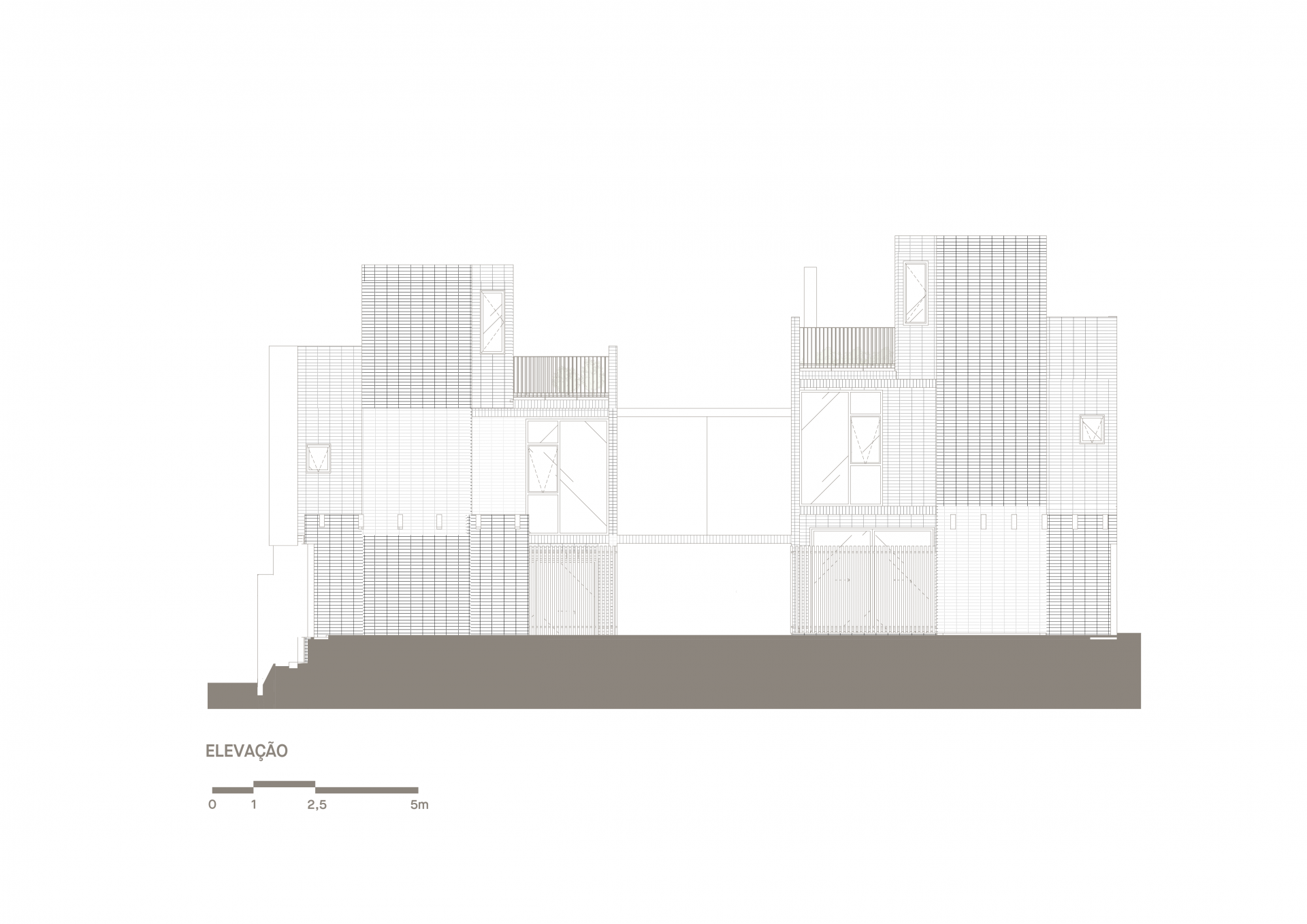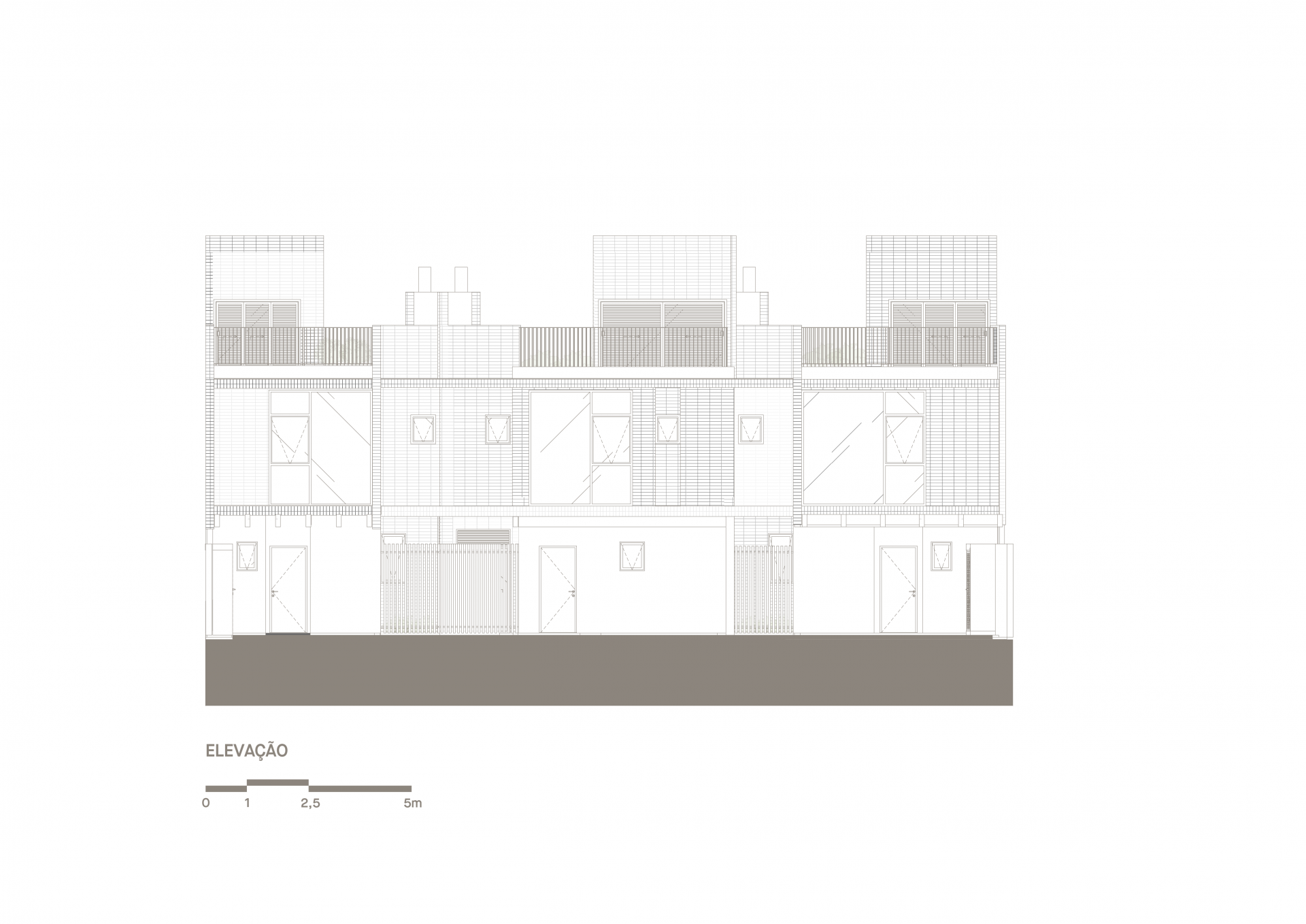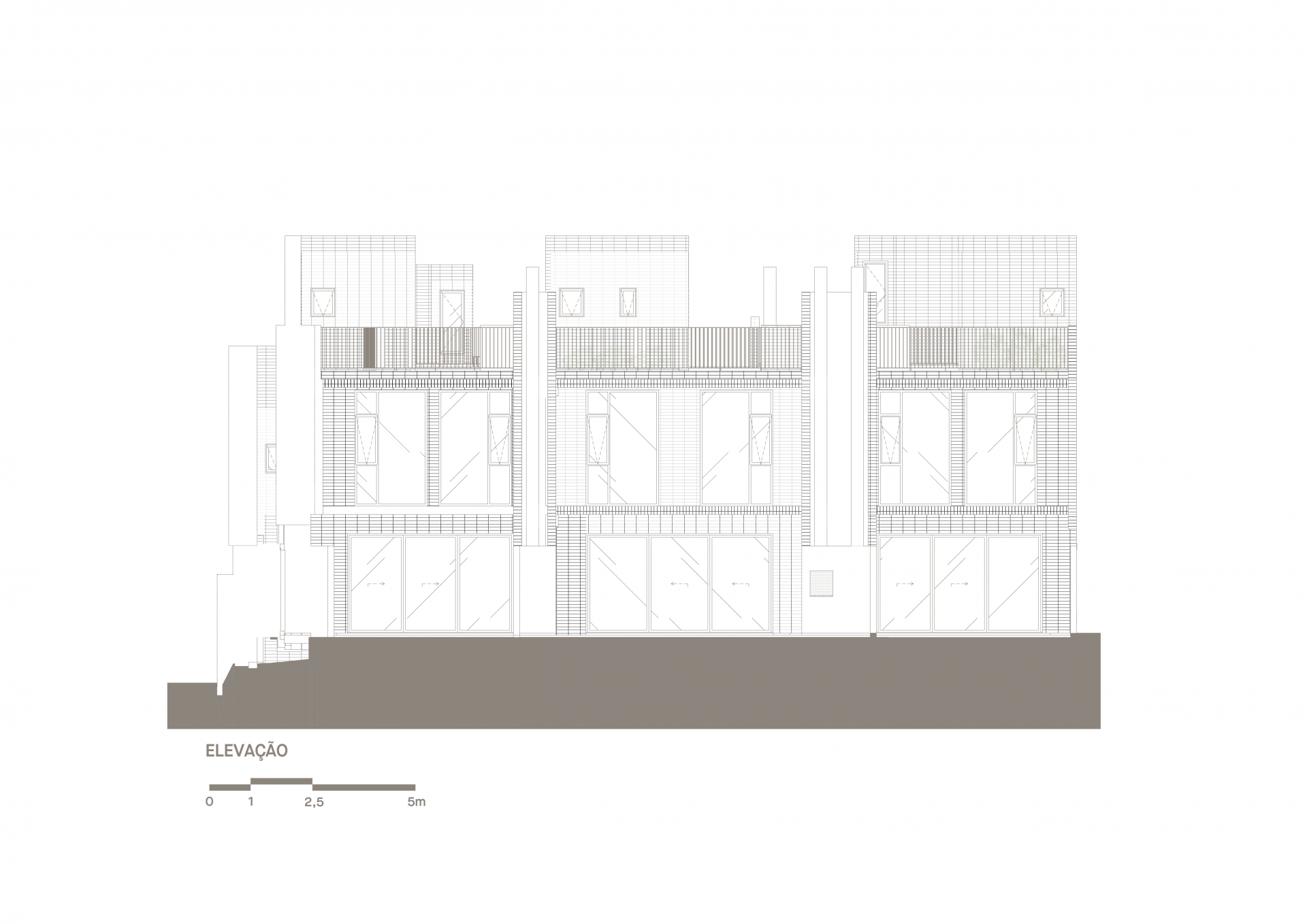 Implanted in a neighborhood of Curitiba marked by green areas and uneven terrain, this project of serial residences explores internal green living spaces and creates terraces that offer views to the city. The sloped terrain is respected in the placement of the houses, first separated into two portions, with a lower plateau at the front and a higher plateau at the back. Conceived within a concept of a neighborhood village, the Ocá Houses are arranged with the opening of a central corridor and a transversal access, creating an internal square for living and leisure. The volume of the five serial houses has been divided into two floors and an open garden terrace, for the use of the roof as a social space and to enhance the views to the city. The internal spaces follow a standard program, however, they are individually designed for better use of the land. On the ground floor, they are integrated, with kitchen and dining and living areas, as well as direct connection to the external gardens and the barbecue area. On the upper floor, the bedrooms are aligned in the east-west direction and located to receive the most amount of light. In order to explore natural lighting, uncovered internal garden cuts are created on the ground floor and large openings in the internal spaces, allowing more light and ventilation to enter. The volumetry of the facades is marked by solids and voids, setbacks and advancements that enhance perspective and create light and shadow planes. The external walls, proposed in light and dark planes, receive a coating of ceramic plates aligned horizontally and the structure marked with plates aligned vertically. The dark tones also appear in the black metals and in the wooden slats that cover the front wall. The project, while valuing the sense of community and collectivity with the creation of the internal square, seeks private leisure spaces, maintaining the privacy of each residence and the spacial individuality of each family.