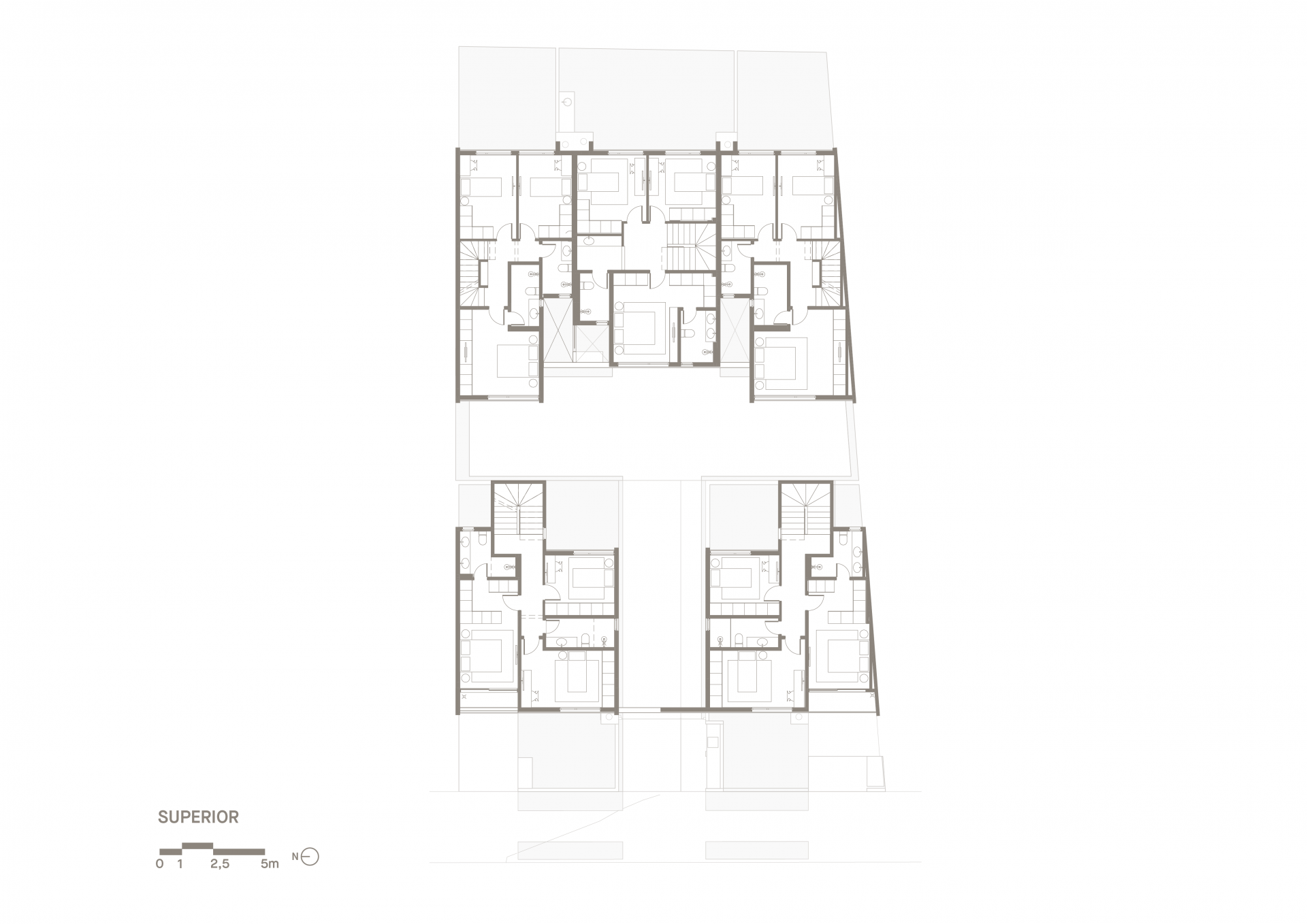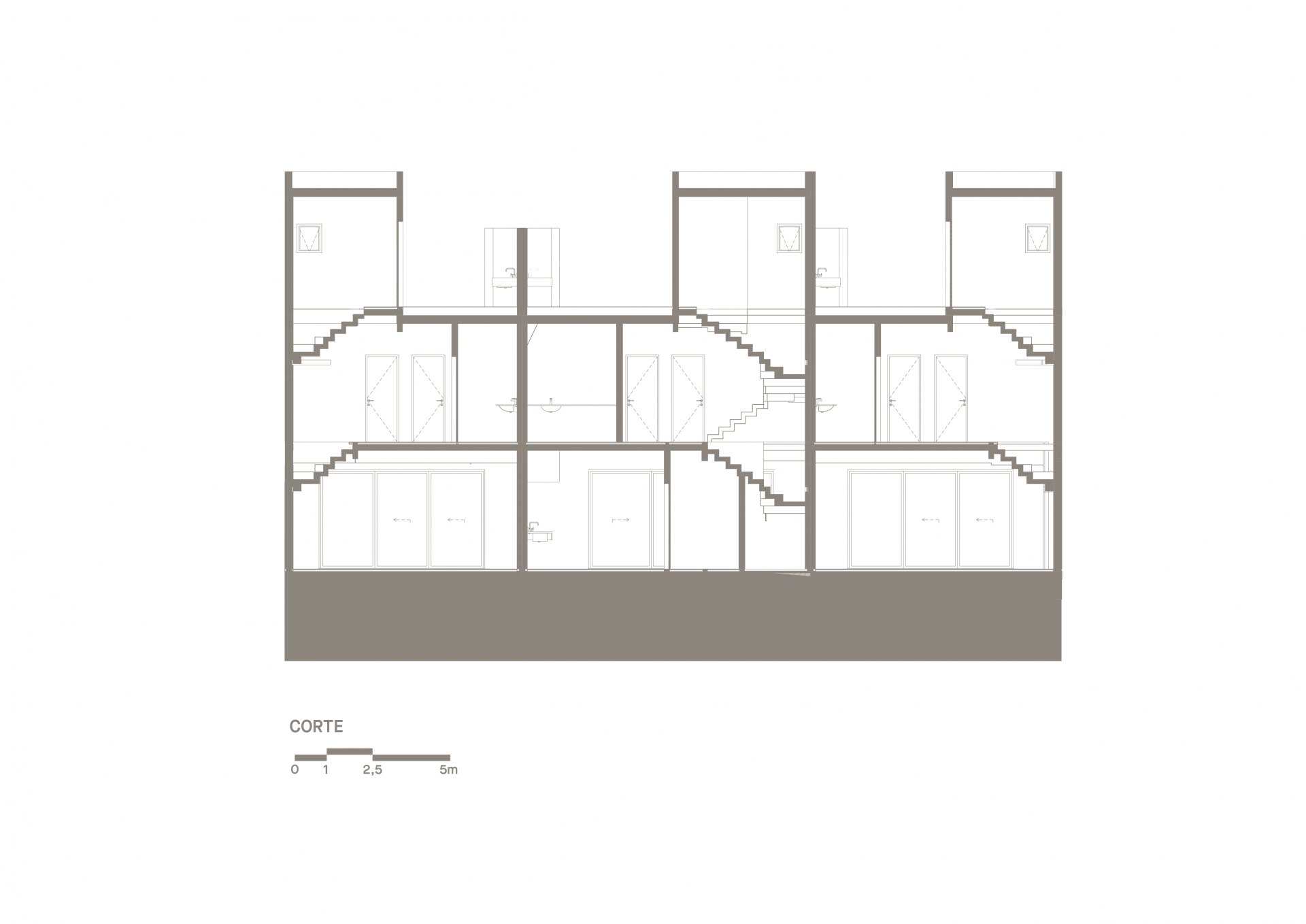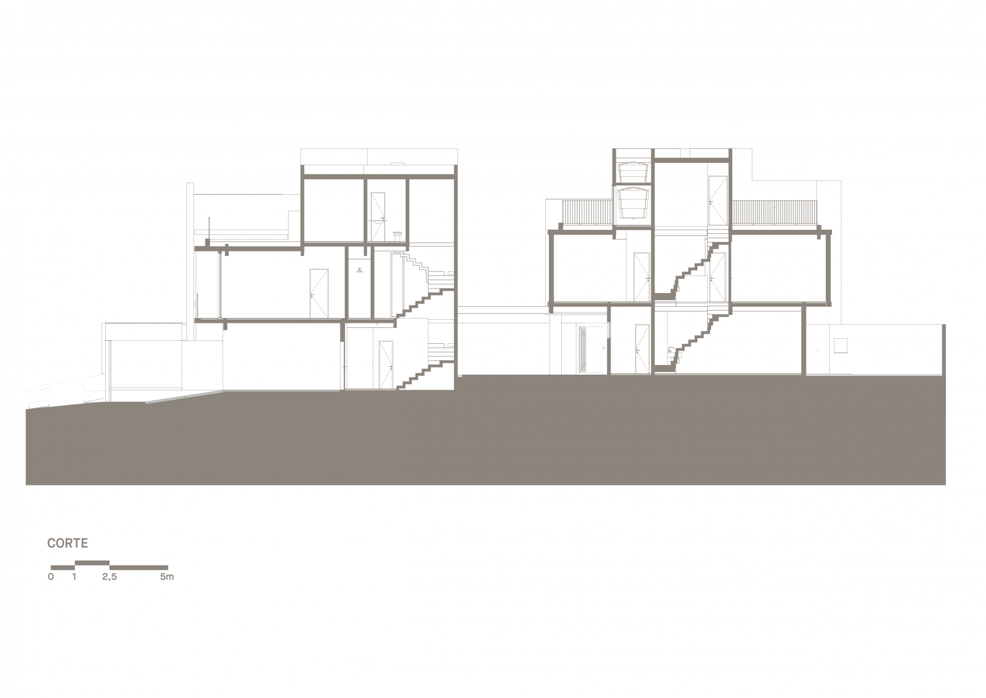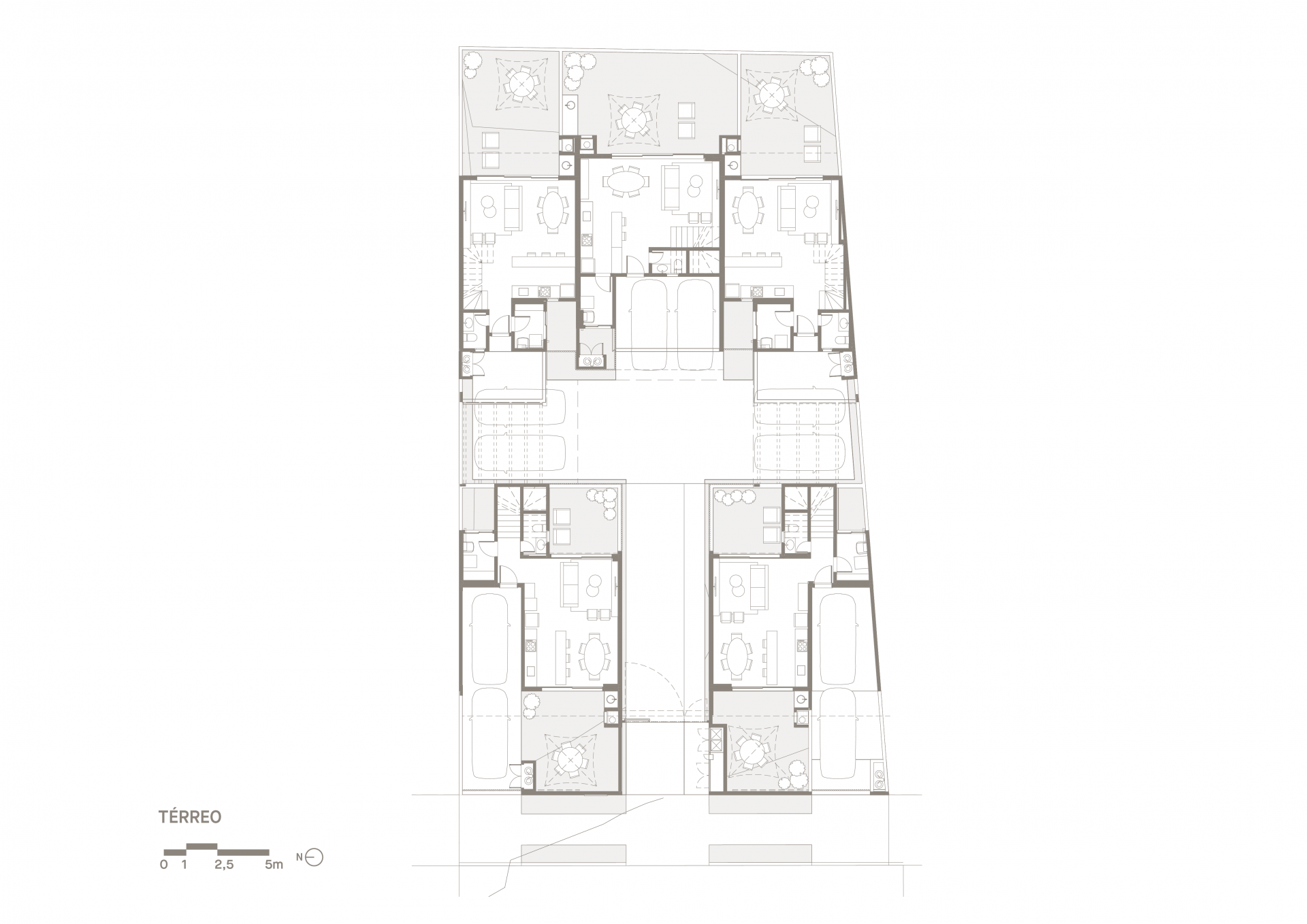 Implanted in a neighborhood of Curitiba marked by green areas and uneven terrain, this project of serial residences explores internal green living spaces and creates terraces that offer views to the city. The sloped terrain is respected in the placement of the houses, first separated into two portions, with a lower plateau at the front and a higher plateau at the back. Conceived within a concept of a neighborhood village, the Ocá Houses are arranged with the opening of a central corridor and a transversal access, creating an internal square for living and leisure. The volume of the five serial houses has been divided into two floors and an open garden terrace, for the use of the roof as a social space and to enhance the views to the city. The internal spaces follow a standard program, however, they are individually designed for better use of the land. On the ground floor, they are integrated, with kitchen and dining and living areas, as well as direct connection to the external gardens and the barbecue area. On the upper floor, the bedrooms are aligned in the east-west direction and located to receive the most amount of light. In order to explore natural lighting, uncovered internal garden cuts are created on the ground floor and large openings in the internal spaces, allowing more light and ventilation to enter. The volumetry of the facades is marked by solids and voids, setbacks and advancements that enhance perspective and create light and shadow planes. The external walls, proposed in light and dark planes, receive a coating of ceramic plates aligned horizontally and the structure marked with plates aligned vertically. The dark tones also appear in the black metals and in the wooden slats that cover the front wall. The project, while valuing the sense of community and collectivity with the creation of the internal square, seeks private leisure spaces, maintaining the privacy of each residence and the spacial individuality of each family.