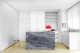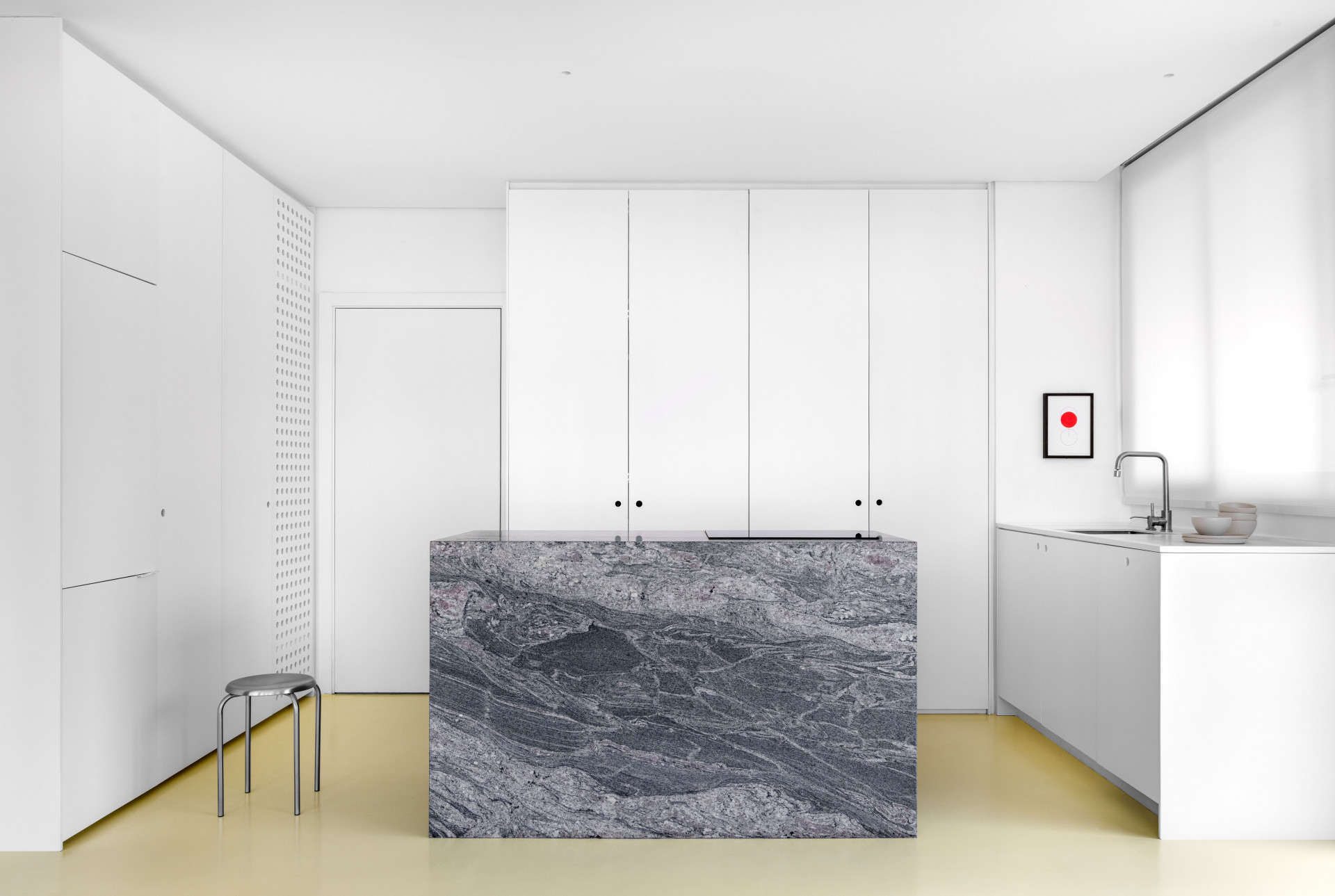 A ideia de monolito também se manifesta na ilha da cozinha, revestida em granito piracema, como um grande bloco de pedra que se ancora no espaço.
