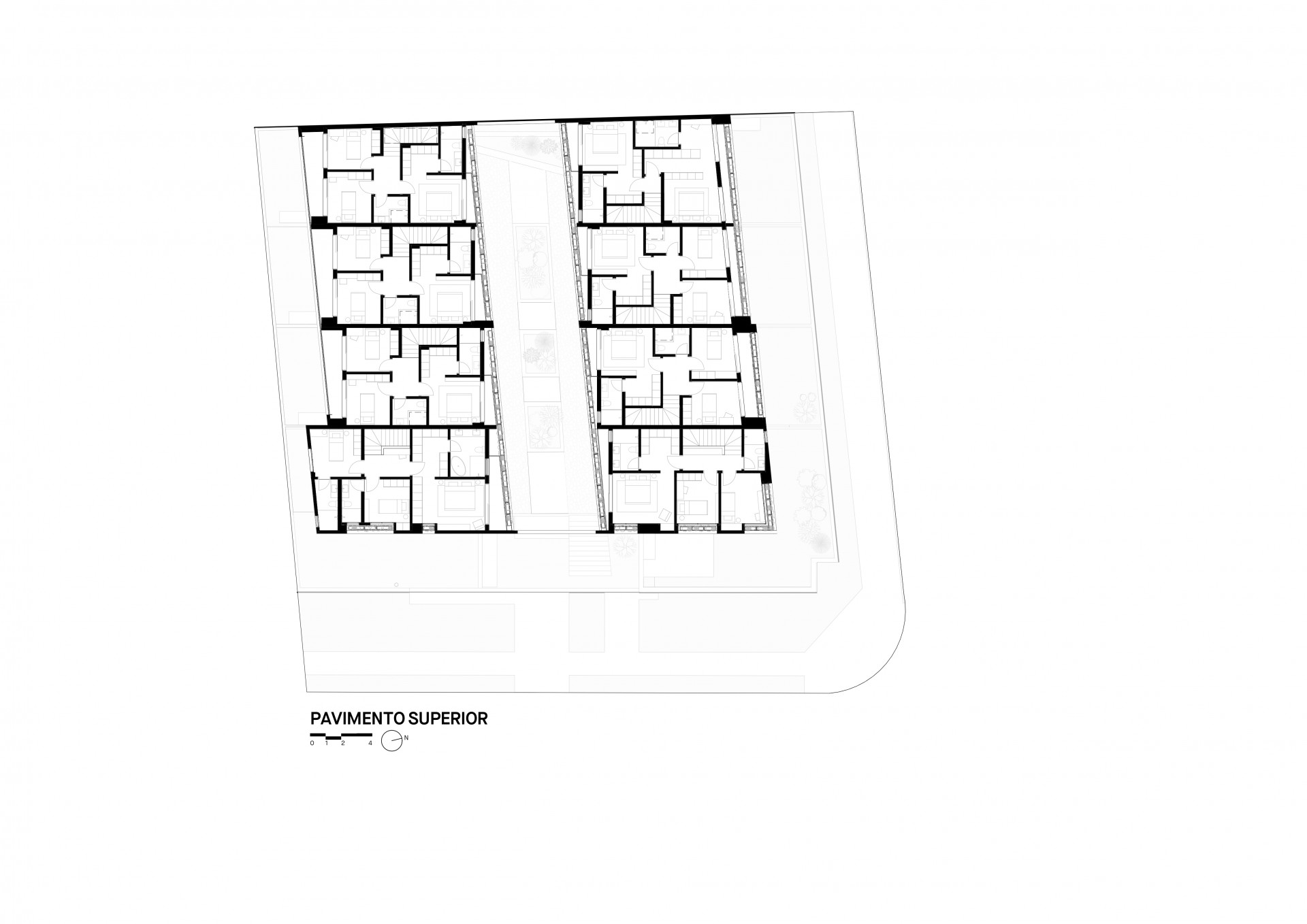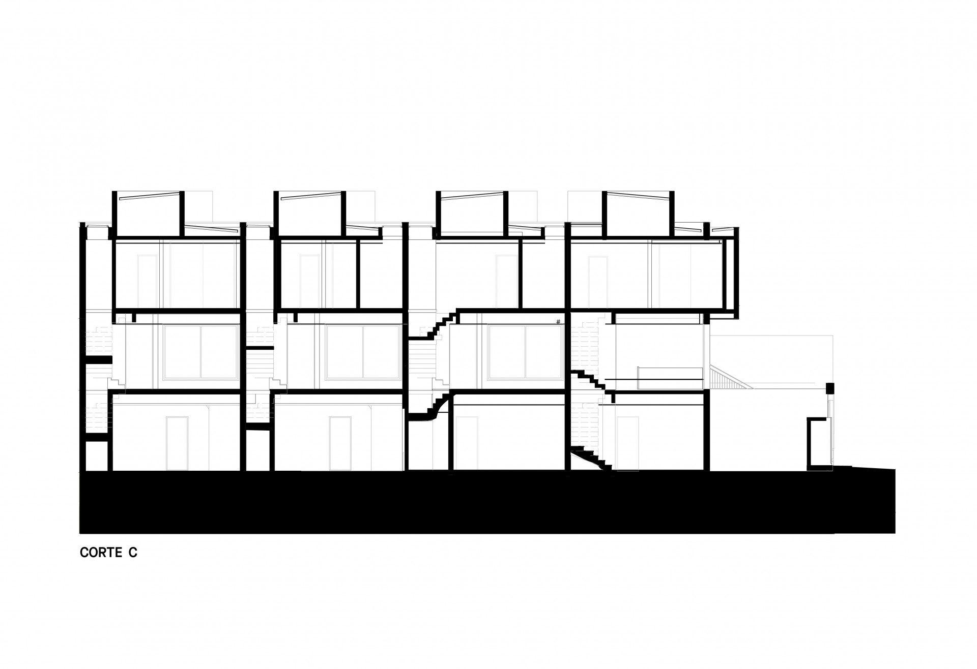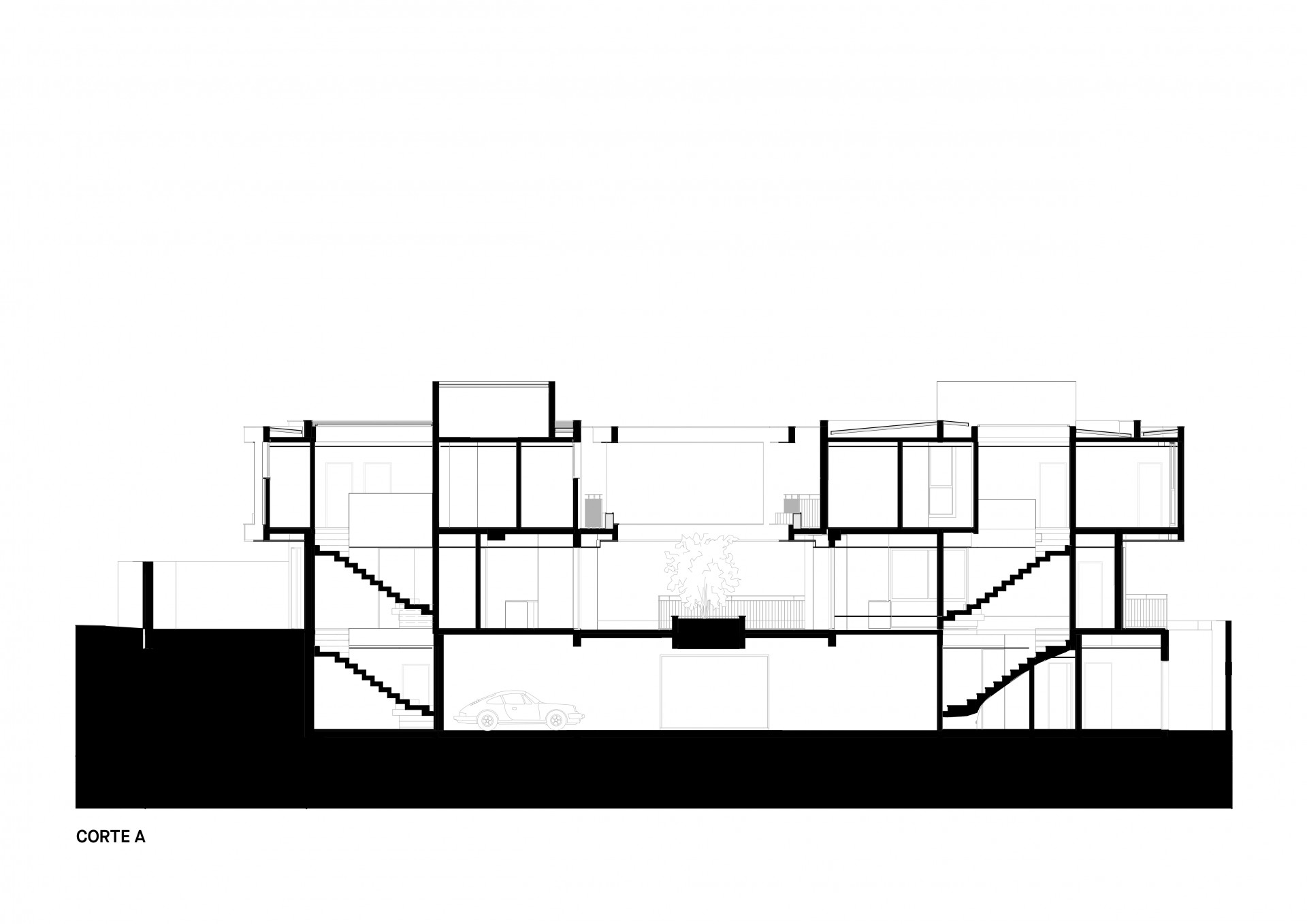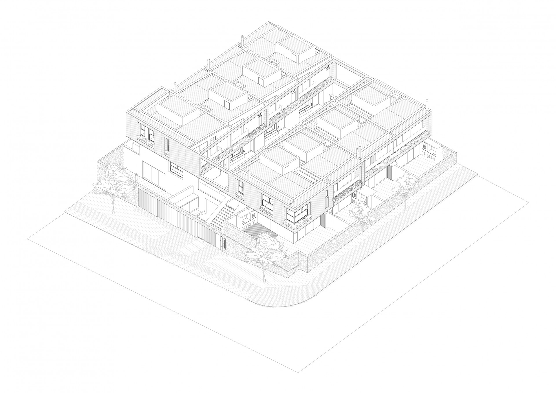 Condensar e atravessar. Permear o que é sólido. Sobre um lote de esquina que conforma um desnível entre duas vias se projeta um conjunto de oito casas em série que busca confrontar esses conceitos que parecem antagônicos.