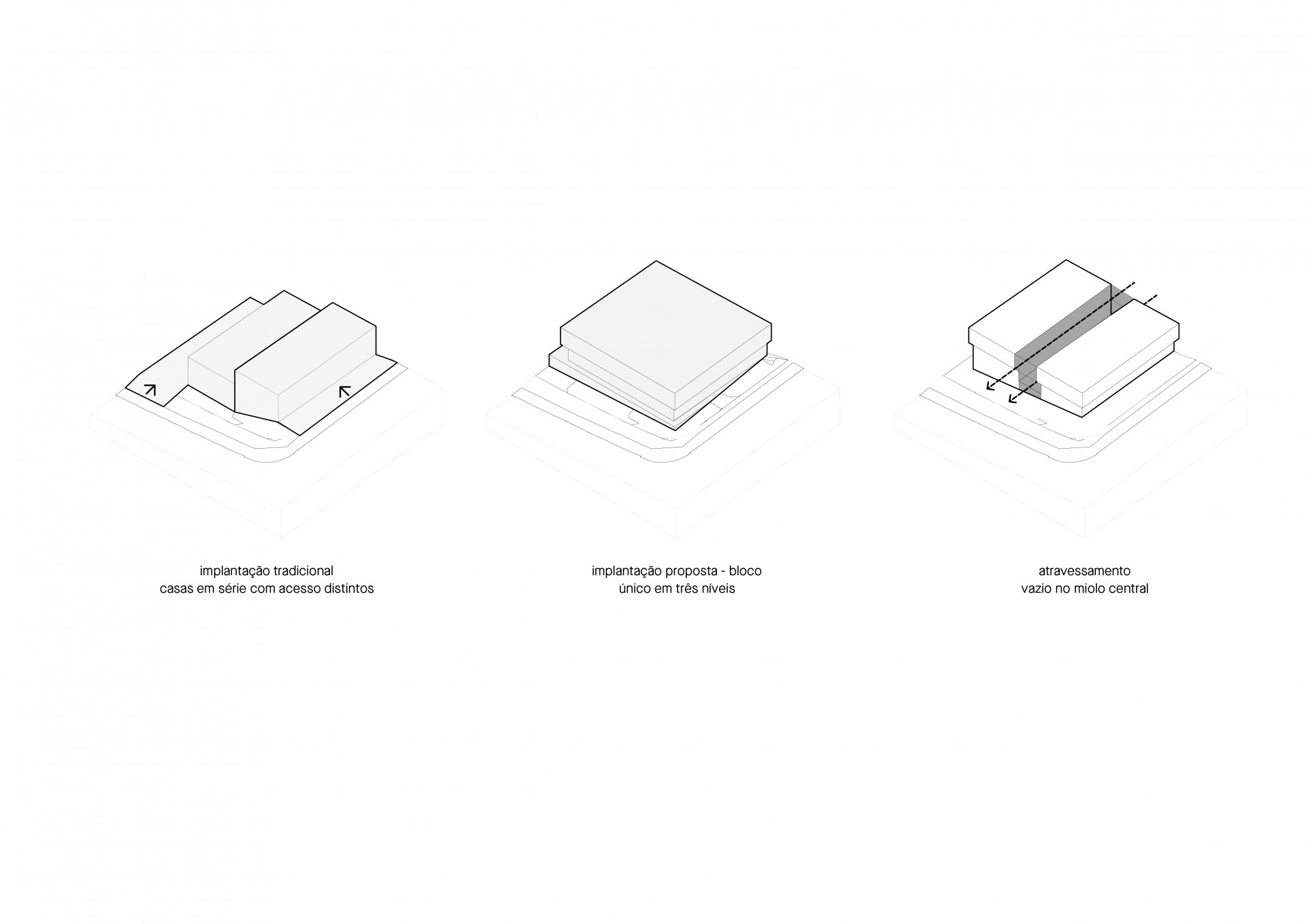 A unidade formal do projeto trata o conjunto como um único bloco contínuo. No entanto, esse volume é rasgado ao centro, criando um vazio que organiza os acessos e fluxos das habitações. O vazio gerado por esse miolo é também preenchido pelo movimento dos moradores para criar espaços de encontro entre os habitantes. O desnível do terreno permite que o acesso de veículos ocorra pelo nível inferior, onde se localizam as garagens, depósitos e áreas de serviço. Assim, o pavimento térreo eleva-se como uma grande praça interna com floreiras, bancos e acessos diretos às áreas sociais das casas, reforçando a ideia de vilarejo ao criar aberturas para esse centro que permitem o atravessamento de visuais, maior insolação e ventilação cruzada nos ambientes.