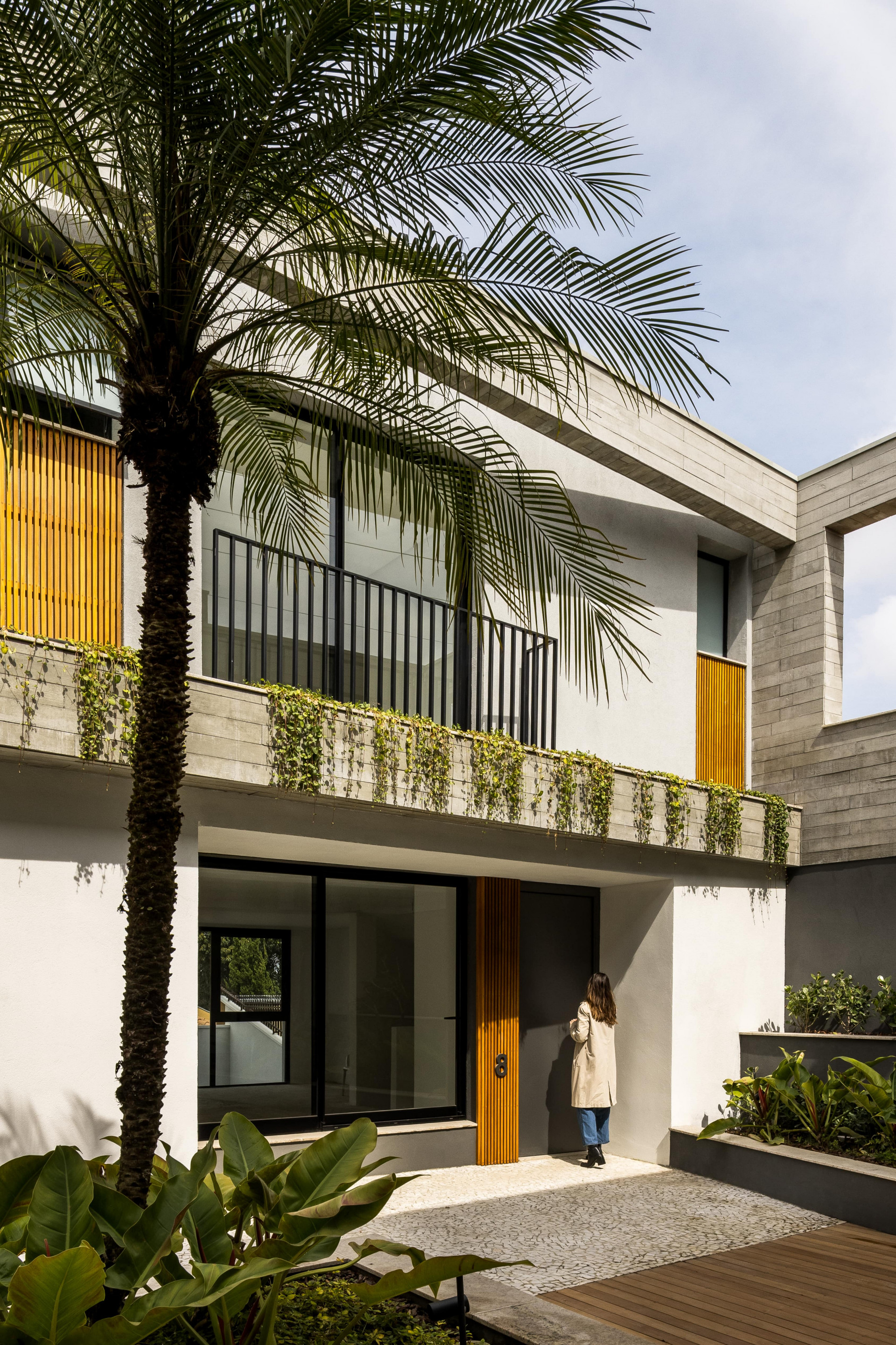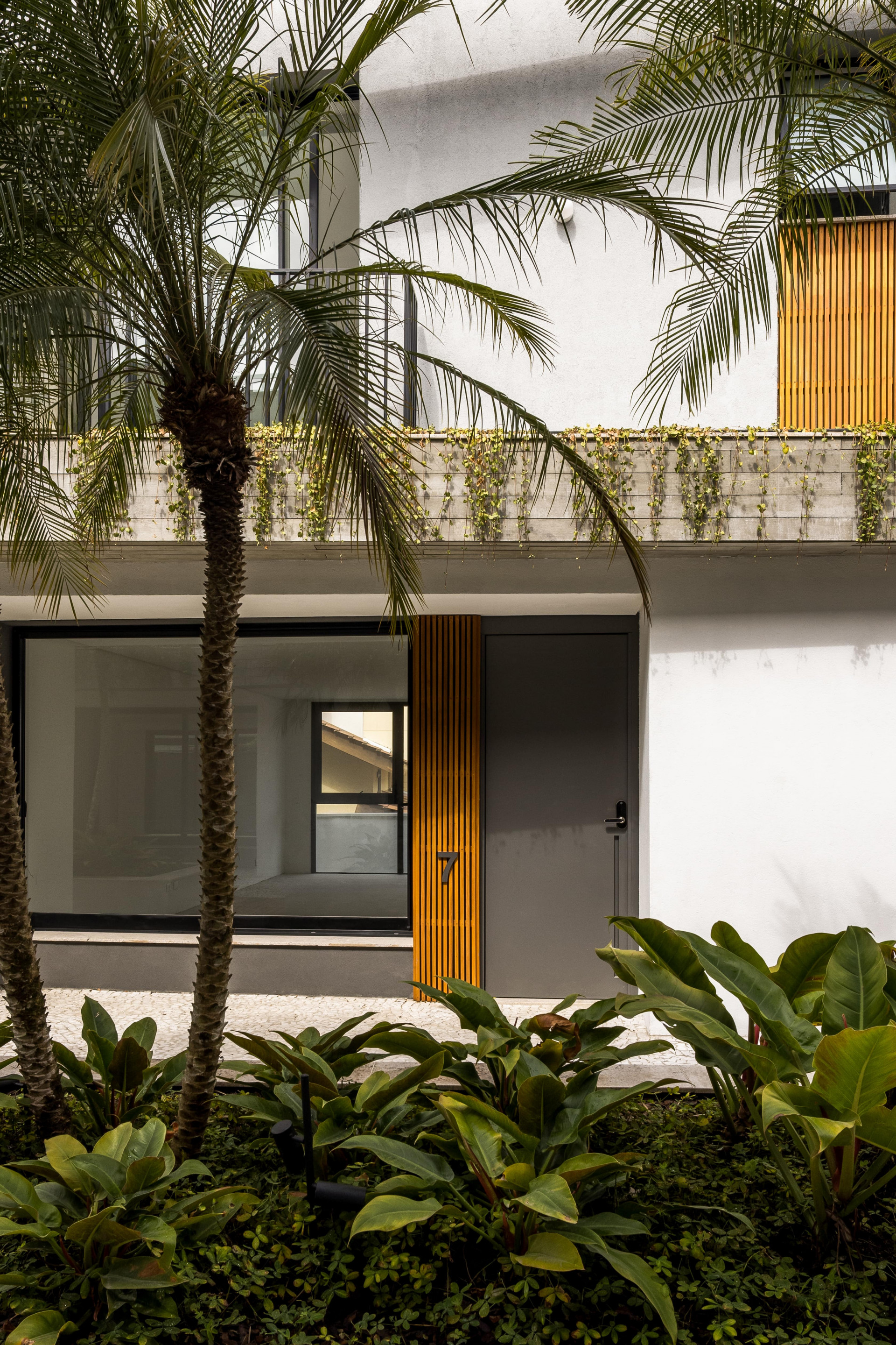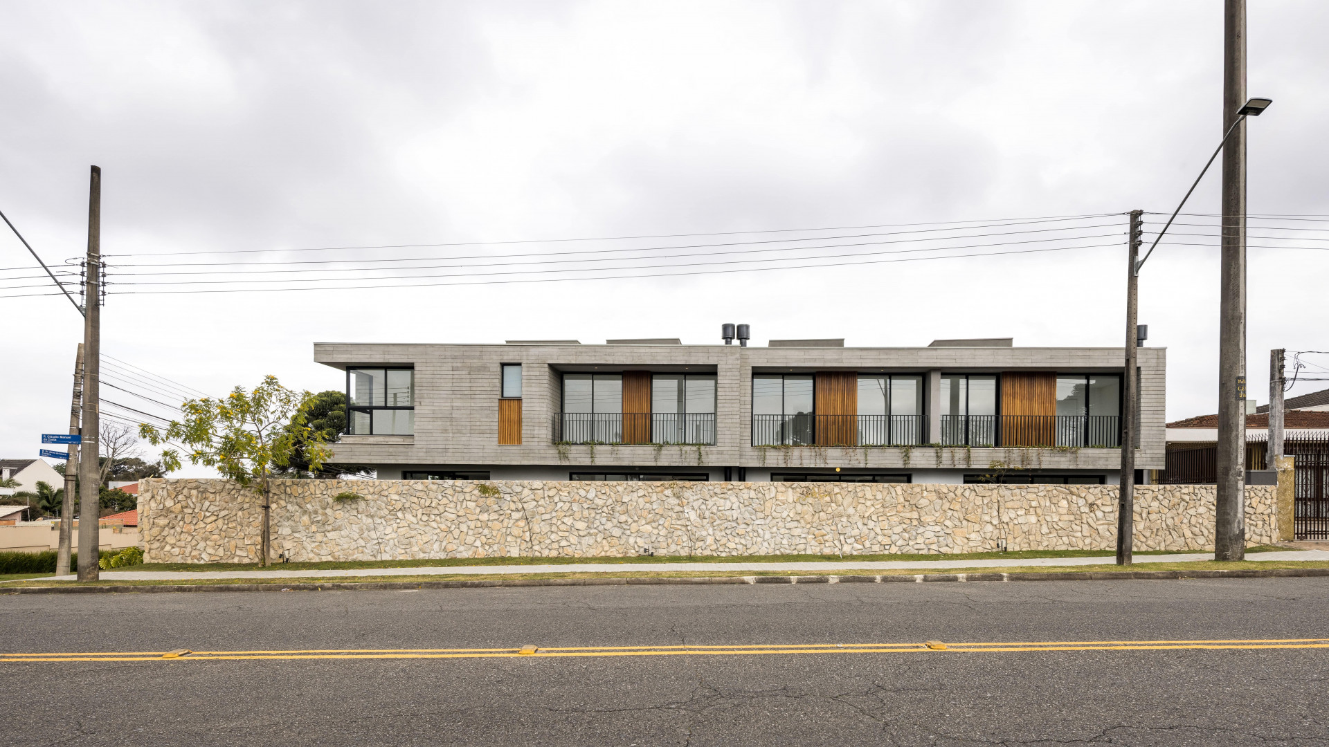 Os muros de divisa recebem um revestimento de pedra que busca consolidar a ideia de solidez da base. Já o volume superior é coberto por placas cimentícias e painéis de madeira, que contrastam com as texturas do térreo. As aberturas recuadas, além de trazerem profundidade, abrigam floreiras. Na esquina, uma janela em ângulo evidencia a continuidade da fachada e suaviza a volumetria ao revelar sua permeabilidade.